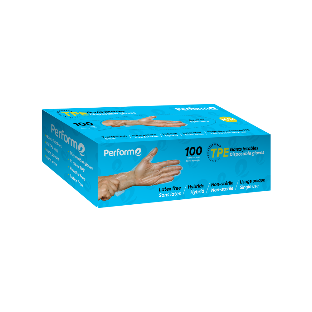 • Polymère extensible TPE• Usage unique• Jetables• Sans poudre• Sans latex• Hybride• Non-stérile• Tenir à l’écart de la chaleur• Stockage à 10 - 40 celcius• Garder au sec